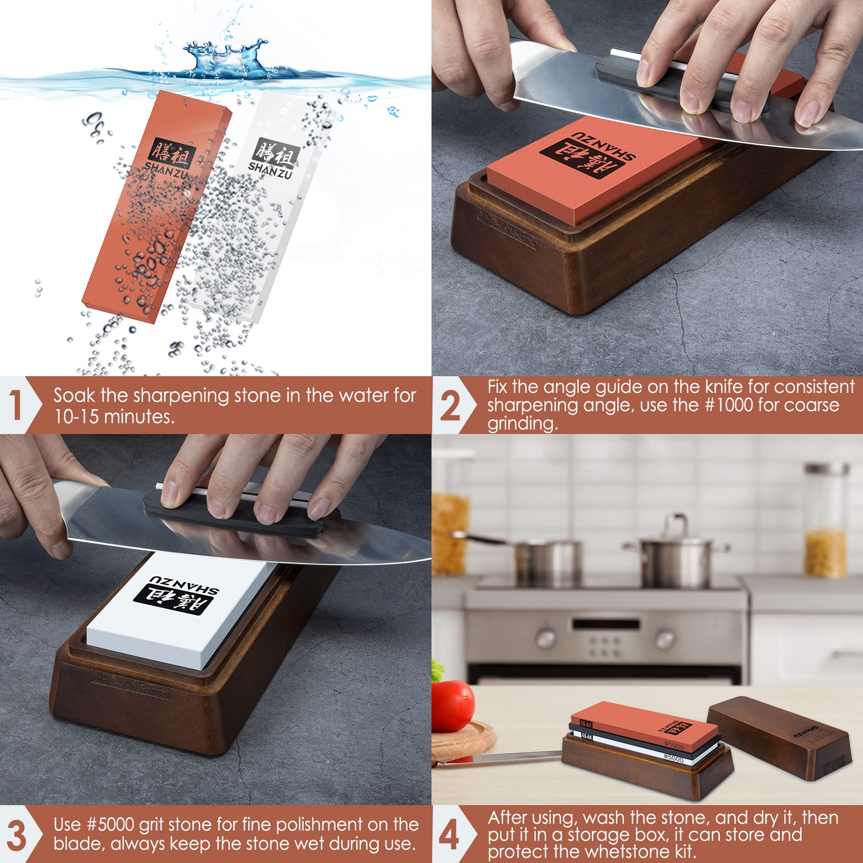 - Use the bamboo base to hold the whetstone and the wear angle guide for the knife and prepare for sharpening.