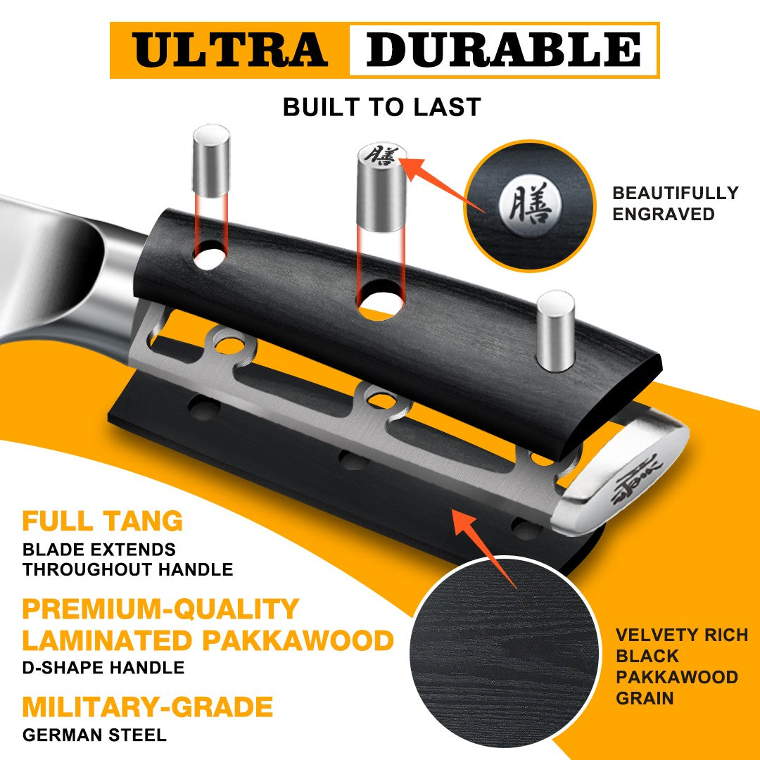 - Material: this cleaver knife is made of high carbon stainless steel input from German, the hardness of this steel is about HRC55, it is much higher than average steel.