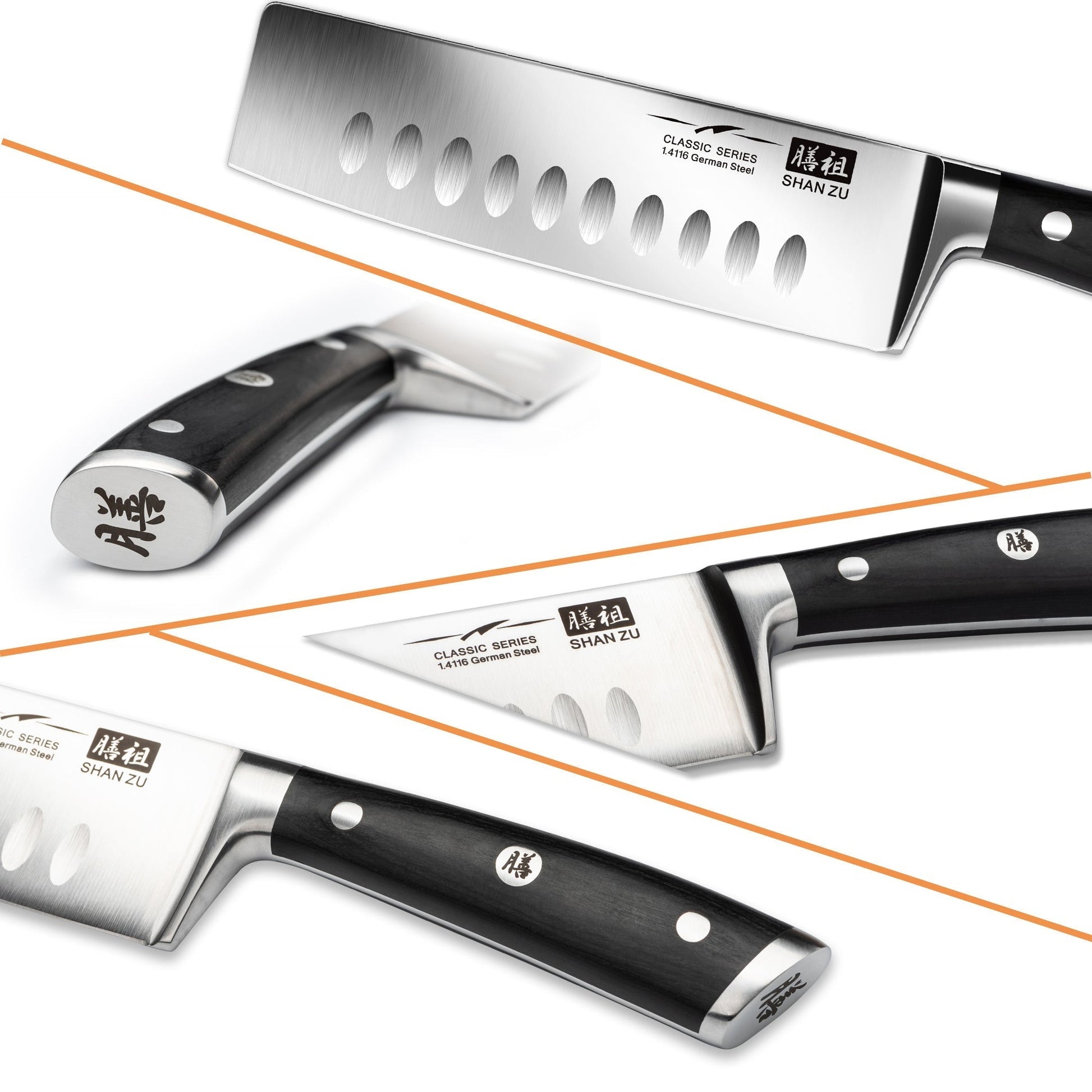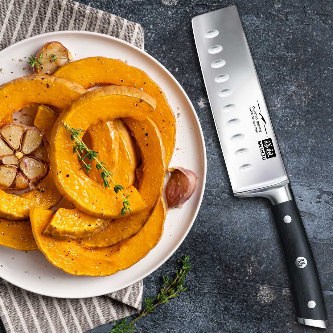 - Vegetarian Favorite: The SHAN ZU 6.5-inch nakiri knife is ideal for quickly and efficiently chopping, slicing or mincing vegetables and fruit. The sleek blade with hollow-ground indentations helps food release from the blade more easily.