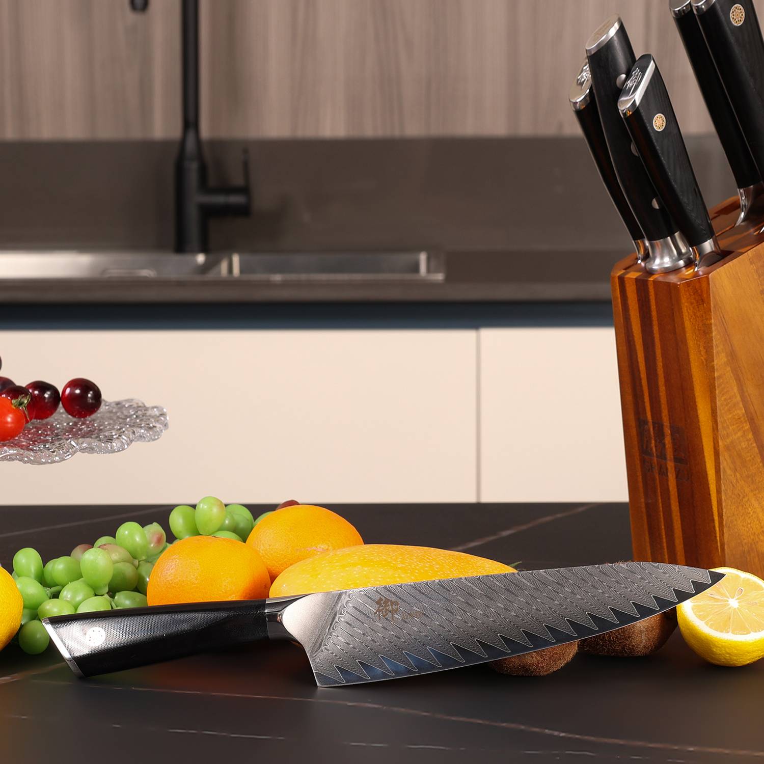 This well-equipped 7-piece Damascus knife set is created to meet the demanding work of a busy kitchen. The block design provides easy access to your tools without taking up too much counter space.