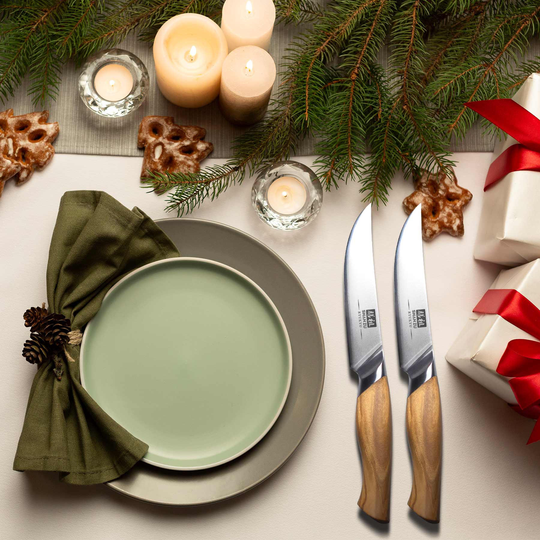 SHAN ZU steak knives are crafted with a high-quality 10CR15MOV steel core, ensuring exceptional sharpness and durability. With a hardness of 60 HRC, these knives resist wear and maintain their edge for longer, making them perfect for slicing through steaks with ease. The handles are made from durable natural olive wood, providing not only a sturdy grip but also a beautiful aesthetic.
