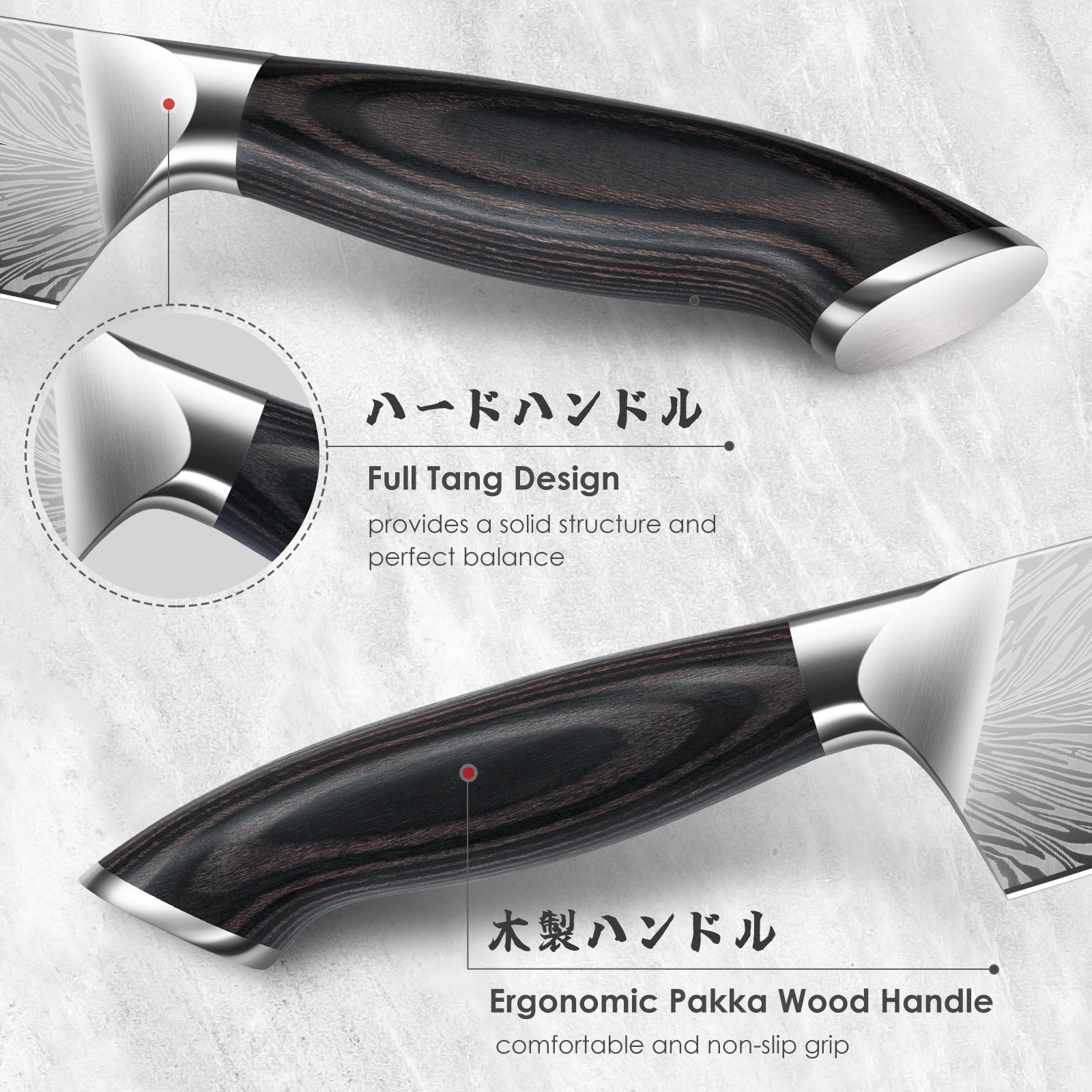 [Ergonomic & Comfortable Wood Handle] The kitchen knives blade seamlessly integrates with a comfortable handle, providing you with a perfect grip. The ergonomic shape offers the right balance between handle and thin blade, ensuring easy maneuverability. Made of durable pakkawood, known for its excellent resistance, the handle is solid and ergonomically balanced.